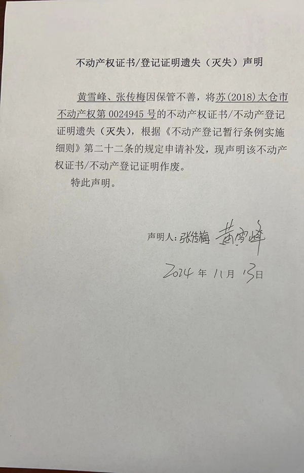 不动产权证书/登记证明遗失(灭失)声明