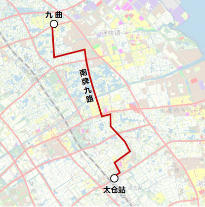 铁路太仓站—站东路—339省道—马路塘路—新港路—牌新路—新港公路—牌九路—红新路—西浮宅路—牌九路—九曲