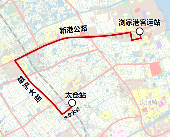 铁路太仓站—站前大道—太仓大道—融沪大道—新港公路—茜星路—飞马路—龙江路—浏家港客运站