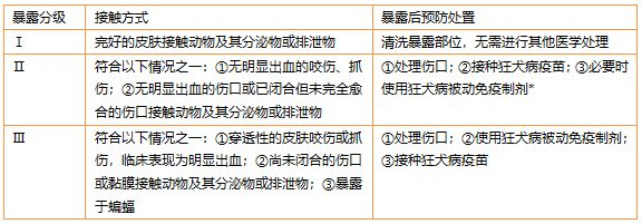 *当判断Ⅱ级暴露者存在严重免疫功能缺陷等影响疫苗免疫效果的因素时,或虽是Ⅱ级暴露但咬伤位于头、面、颈部、手部和外生殖器等神经丰富的部位时,也建议给予狂犬病被动免疫制剂。